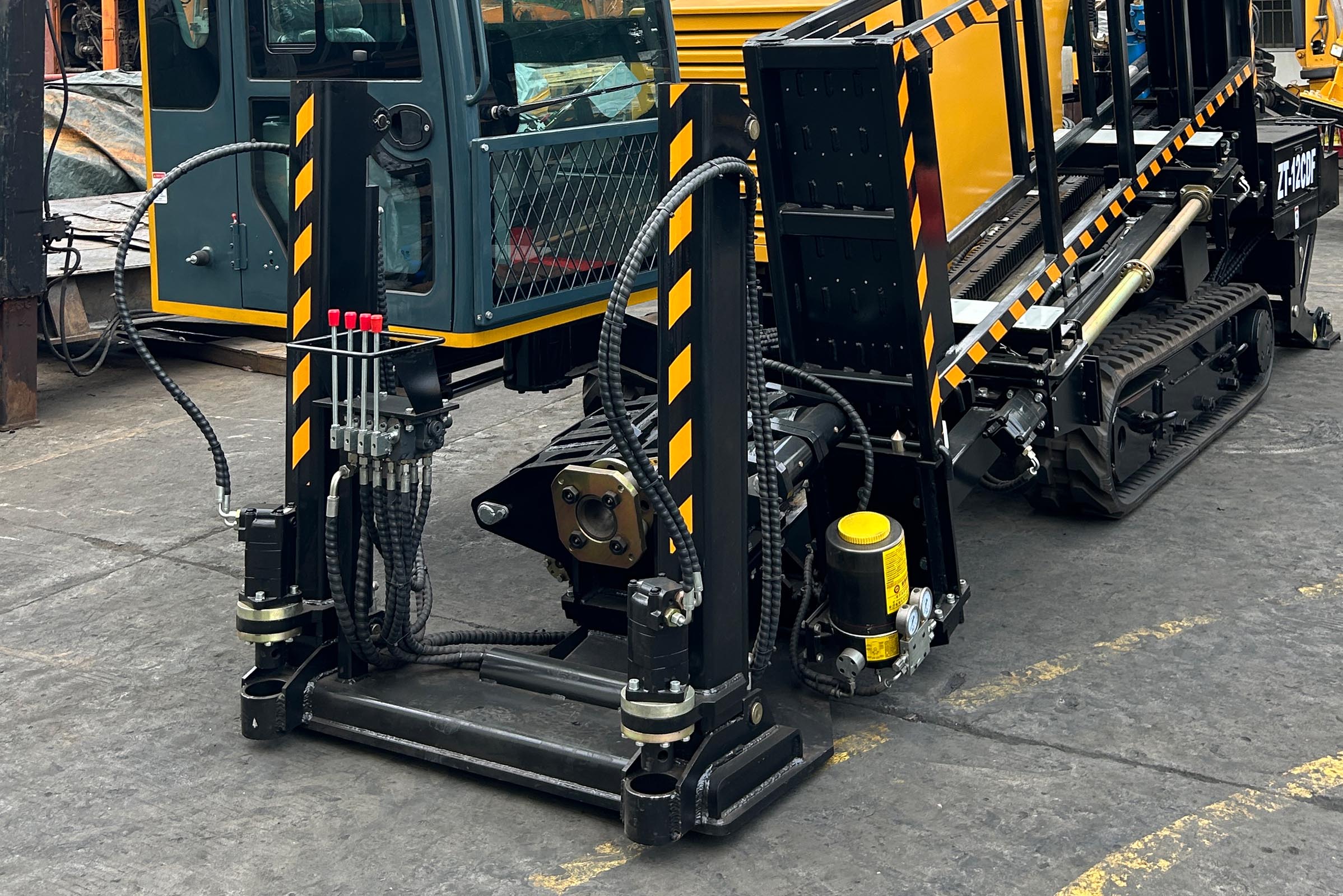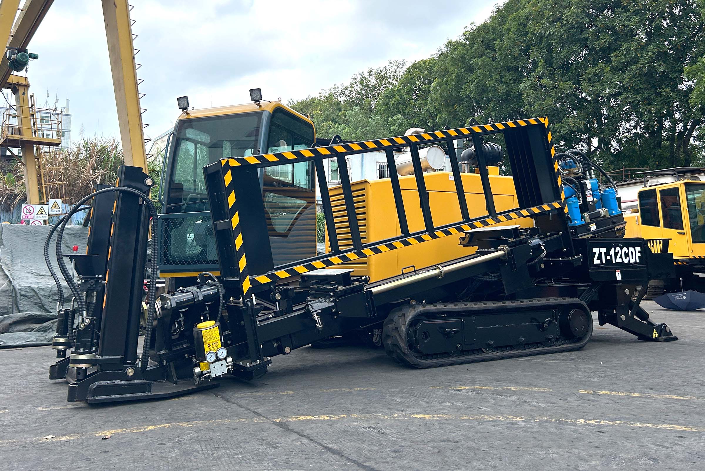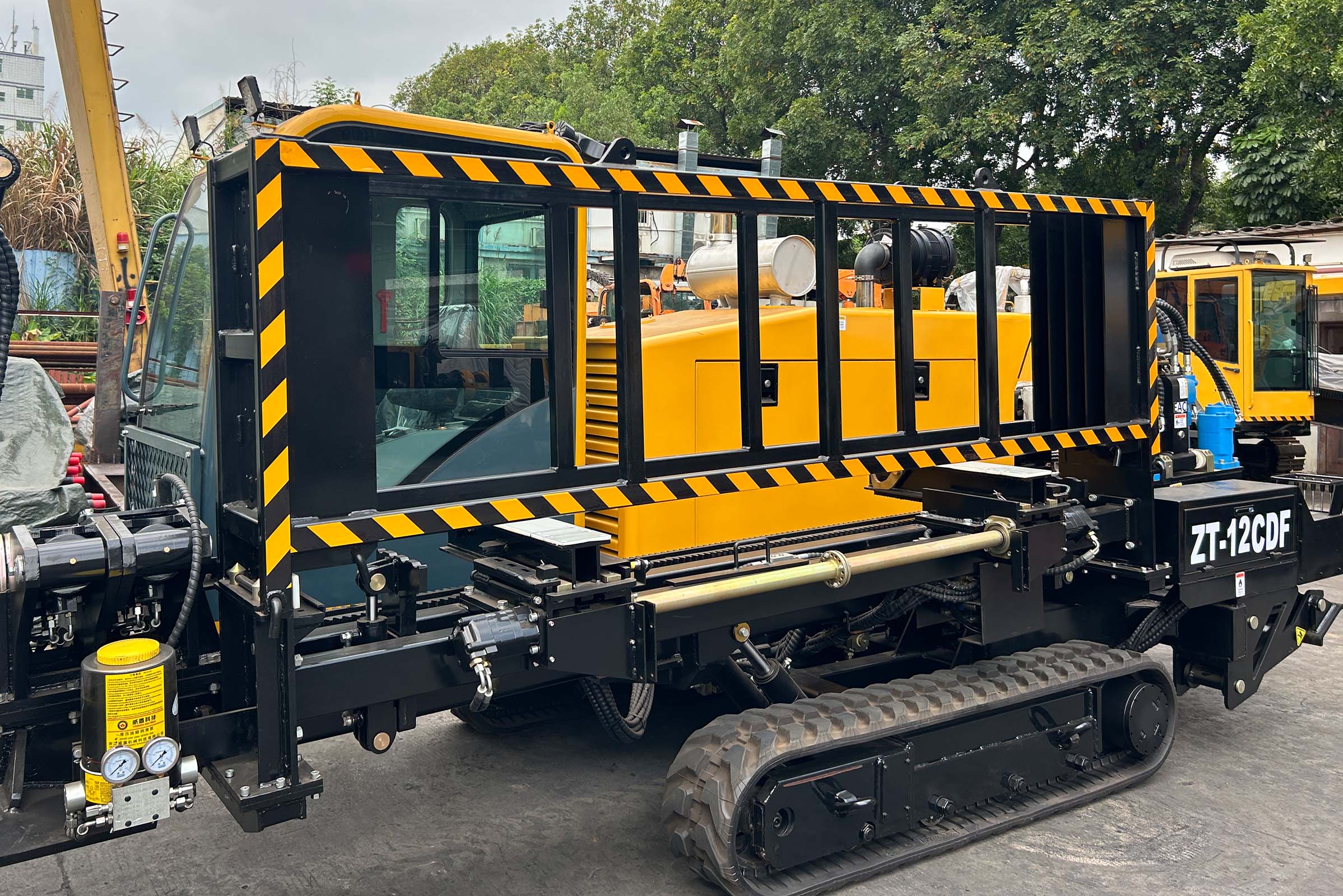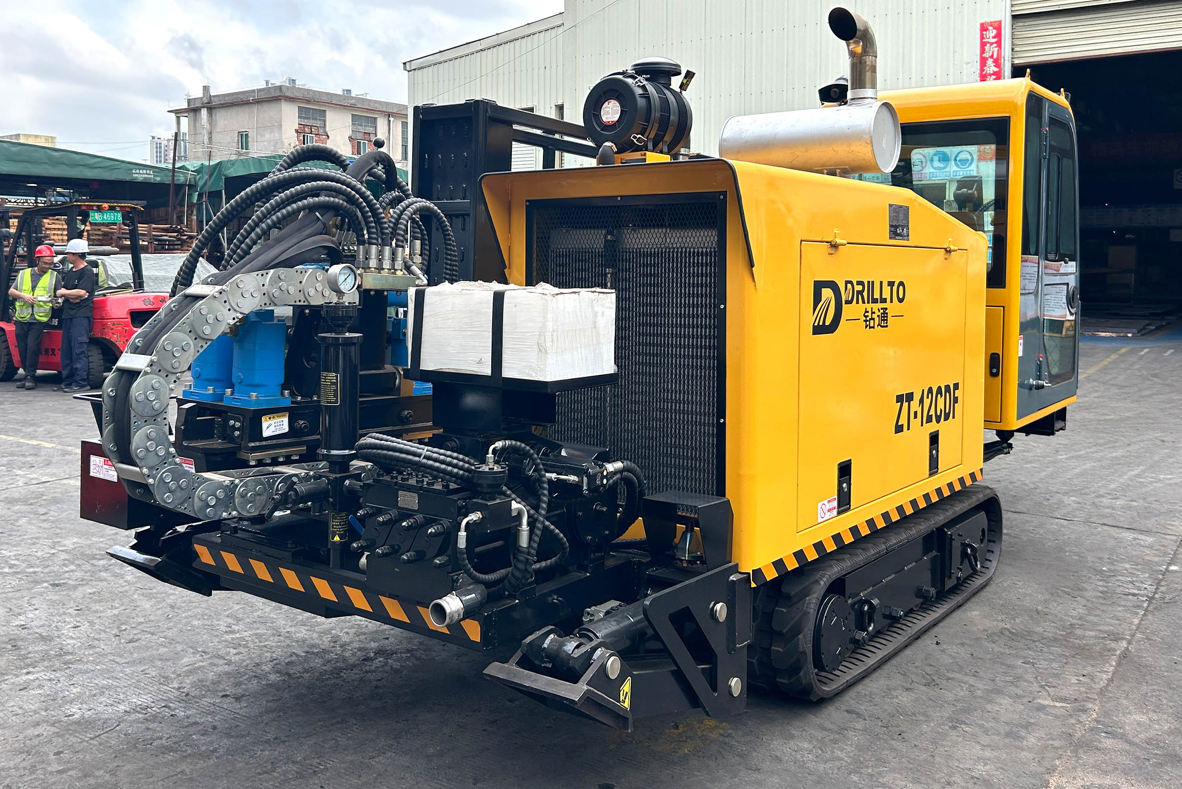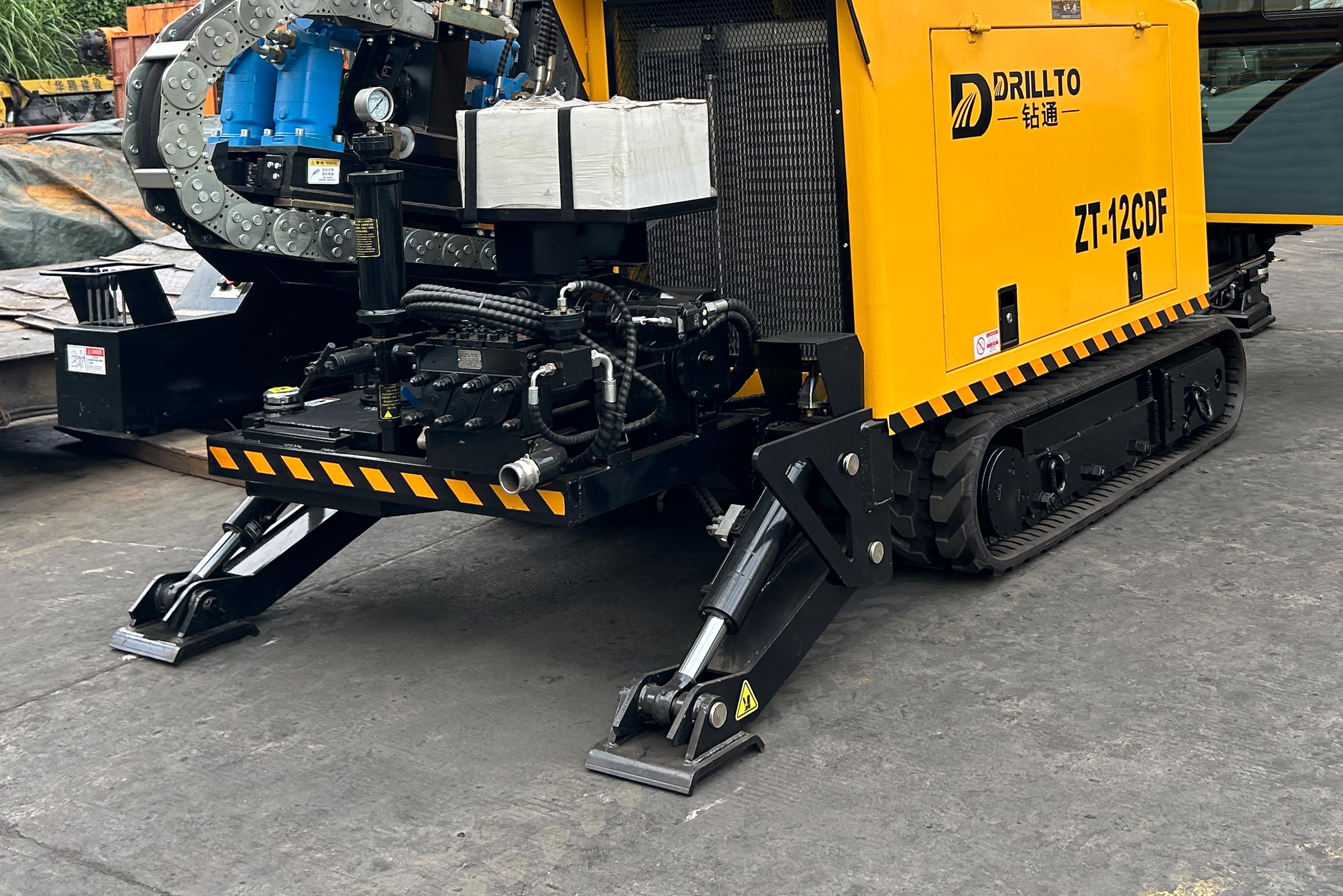 Установка ГНБ Drillto ZT-12CDF. Простая и надежная модель с реечной подачей, комплектуется кабиной с отопителем и кондиционером для работы в любых погодных условиях, чем не могут похвастаться аналогичные машины данного класса. Двигатель Cummins мощностью 93кВт в связке с качественной гидравликой позволяет развить крутящий момент до 4500Нм, при этом обороты вращения могут достигать 200об/мин. Мощный бентонитовый насос с керамическими цилиндрами, производительностью 180л/мин и клапаном перекрытия - обеспечивает подачу бурового раствора. Анкерная система, кассета на 48 буровых штанг с автоматической подачей и смазкой буровых штанг - все для быстрой и комфортной работы бригады. Также имеется электрический подогрев масла, если нужен прогрев системы в холодное время. Для работы комплекс использует буровые штанги 50x3000мм, резьба D16 FS-1 такая же как на установках VERMEER D16X20, 16x20 SII, D18X20, DDW 10/04. Схожая буровая штанга используется на Forward RX14x50, DDW 13/05, но длиной 2 метра.