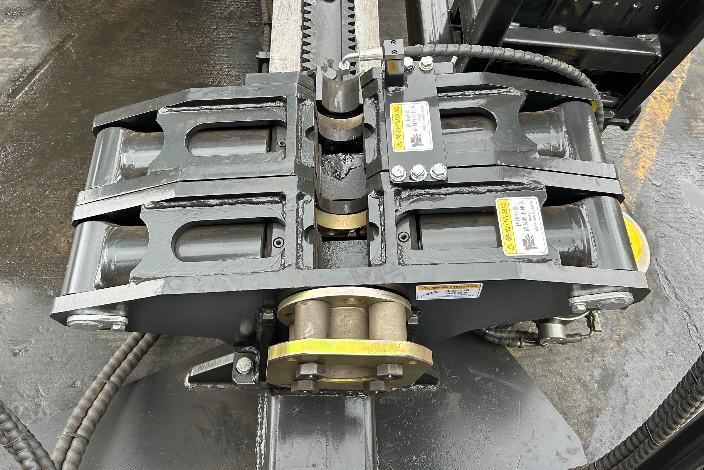 | Тиски буровых штанг В передней части установки расположены тиски для раскручивания буровых штанг. Тиски оснащены очистителем, а также системой смазки резьбы. |